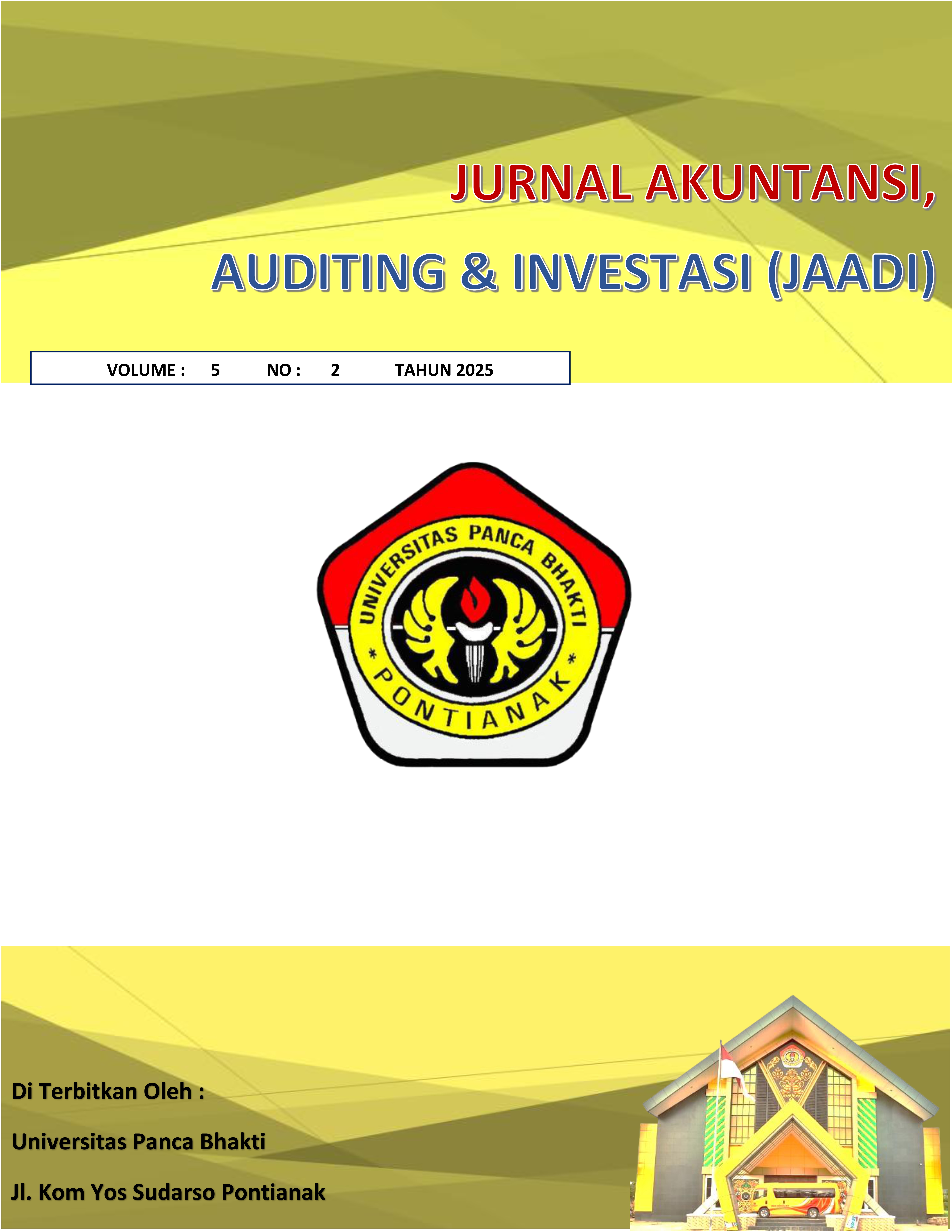 Jurnal Akuntansi, Auditing dan Investasi (JAADI) diterbitkan oleh jurusan akuntansi Fakultas Ekonomi dan Bisnis Universitas Panca Bhakti Pontianak yang diperuntukkan bagi Dosen dan Mahasiswa yang berkepentingan untuk mempublikasi penelitiannya yang bertujuan untuk memberikan kontribusi dalam informasi hasil riset dibidang Akuntansi.
